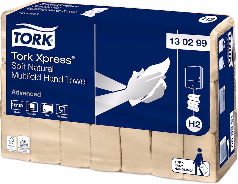 Tork Xpress® Mjuk Multifold Handduk Natur är en miljövänlig pappershandduk i Advanced-kvalitet för H2-systemet.